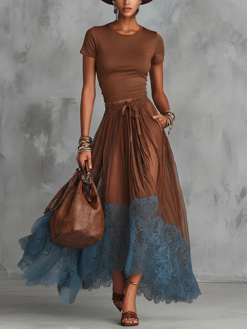 Short-sleeve Top And Lace-panel Midi Skirt Set
